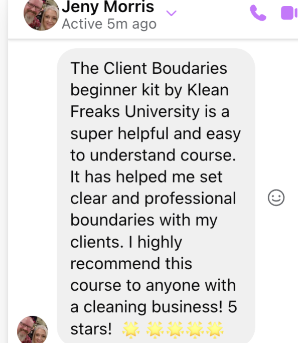 "The Client Boundaries beginner kit by Klean Freaks University is a super helpful and easy to understand course. It has helped me set clear and professional boundaries with my cleints. I highly recommend to anyone with a cleaning business."
