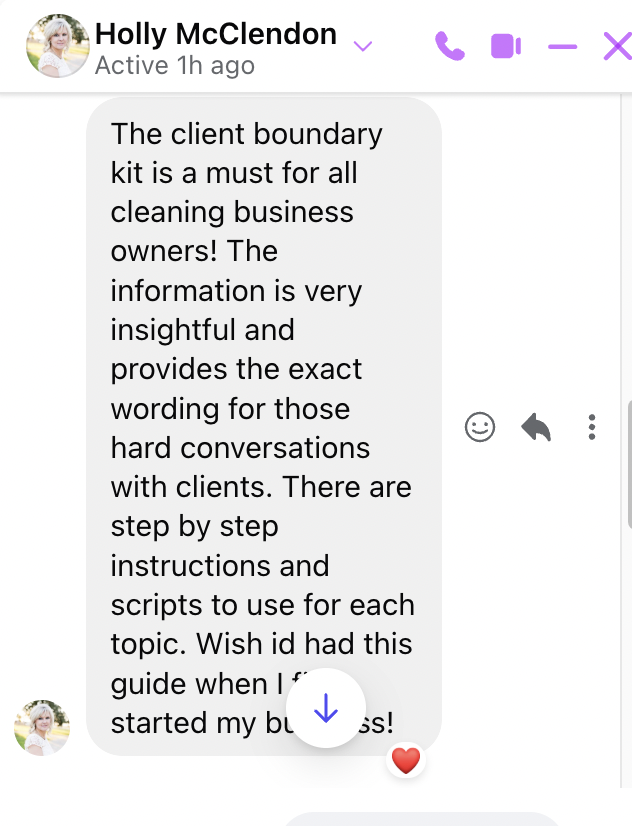 "The Client Boundary kit is a must for all cleaning business owners! The information is very insightful and provides the exact wording for those hard conversations with clients. There are step by step instructions and scripts for each topic. Wish I had this guide when I started my business"